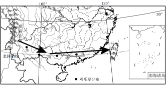 "]]据材料可知,原生于横断山区的濒危植物鸡爪草,分布于2500m-3500m,次盛冰期气温降低,横断山区鸡爪草向低海拔迁移;读图可知,经由华南和东山陆桥向台湾水平扩散;温暖期气温升高,低海拔地区已不适合鸡爪草生存,鸡爪草向高海拔迁移;据所学可知,华南地区缺乏高山,种群灭绝,形成西南-台湾间断分布格局。