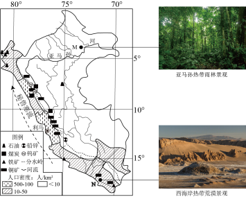 位于南美洲西部的秘鲁西临太平洋,其首都利马位于安第斯山脉西侧山麓,为该国最大的港口,全年少有风浪袭击。该国平均人口密度较低,并且具有分布不均衡的特点,人口大部分集中在相对干旱的西部沿海地区。图为秘鲁示意图。读图,完成下面小题。