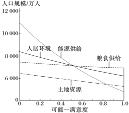 "]根据木桶效应(组成木桶的木板如果长短不齐,那么这只木桶的盛水量不取决于长的木板,而是取决于短的木板)原理,当可能–满意度为0.9时,能源供给所能承载的人口规模最小,故其为制约湖南省人口合理容量的主要因素,A正确,BCD错误。故选A。