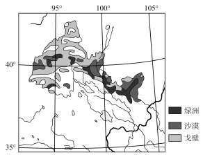 甘肃省戈壁面积广大,政府在戈壁滩积极发展温室大棚等设施农业,以种植北方水果和蔬菜为主,近几年,很多外地种植户选择在甘肃种植火龙果、百香果等热带水果,即“南果北种”。与“南果北送”相比。“南果北种”园水果品质高备受当地消费者青睐。种植户正在尝试种植更多品种的热带水果,让热带水果“扎根”戈壁滩。下图示意甘肃的戈壁分布。