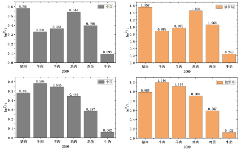 虚拟土地指生产商品和服务时投入的土地资源数量。下图表示2000年和2020年中俄畜牧业农产品虚拟土地含量(单位:公顷/吨)。完成下面小题。