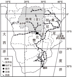 “钴”被誉为“工业味精”,广泛应用于航空航天、石油化工、新能源电池等领域。2022年全球钴探明储量约830万吨,刚果(金)独占48%,且矿石品位高,集中分布于南部高原地区,适宜露天开采。2023年全球新能源汽车用钴量占总需求的65%,中国、美国、德国是主要进口国,合计占比超70%。刚果(金)缺乏直接出海通道,钴矿需经邻国赞比亚铁路运至坦桑尼亚达累斯萨拉姆港,运输成本占出口价格的25%。如图示意非洲铁路和刚果(金)钴矿分布。