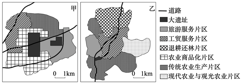 大遗址是占地广、级别高、影响力强的文化遗址。大遗址区包含大遗址及其联系密切的周边环境。大遗址区中,农业商品化片区生产的农产品主要服务于大遗址区旅游。下图示意关中地区甲、乙大遗址区的空间功能分区。据此完成下面小题。