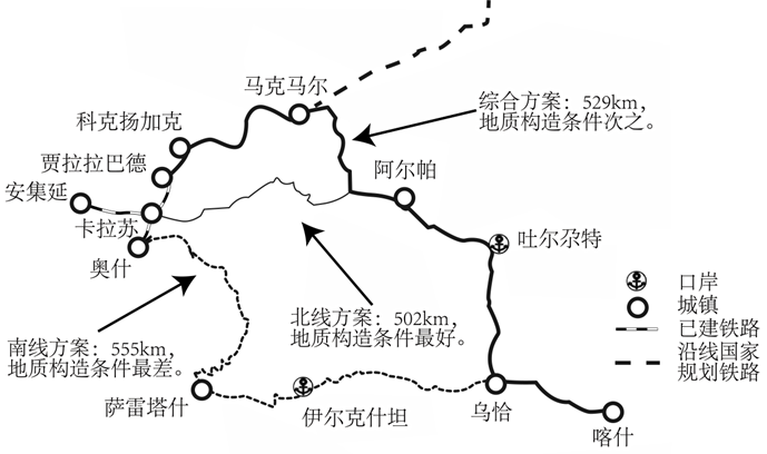 中吉乌铁路东起我国新疆喀什,途经吉尔吉斯斯坦,西至乌兹别克斯坦安集延。该铁路建成后,将成为我国经中亚联系波斯湾、地中海地区便捷的陆上通道。下图示意中吉乌铁路选线方案。据此完成下面小题。