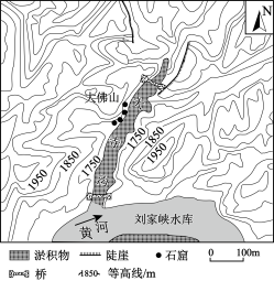 刘家峡水库地处黄河上游的甘肃永靖县境内,于1968年建成蓄水,正常年份水位可高达1735米。在其库尾的黄河岸边有著名的世界文化遗产炳灵寺石窟,石窟主要分布在大寺沟崖壁上(下图),由于泥沙淤积,大寺沟由最初的“V”形沟逐渐淤积成平地。
