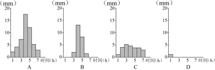地表径流形成过程中,降雨先落到植物上形成植物截留量,多余降雨落到地面,一部分形成下渗量,其余形成地表径流量。四者中降雨量是其他三者的和,对应A选项;植物截留量的出现时间早于下渗量和地表径流量,且只出现在降雨早期,对应D选项;下渗量出现的时间早于或同时于地表径流量,C选项水量出现时间早于B选项,从产生时间出现的早晚可以判断C选项为下渗量,B选项为地表径流量。另外,地表径流量过程一般较集中,下渗量相对平缓,可进一步验证C选项为下渗量,B选项为地表径流量。