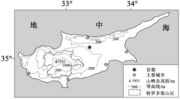 塞浦路斯是以旅游、金融等为主导产业的发达国家,人口增长缓慢。境内的特罗多斯山区壮美的自然风光和怡人的田园风情为其带来丰厚的旅游收入。2010年以来,该山区农业用地大量废弃,给当地旅游业造成冲击。为此,当地规划了废弃农业用地的恢复方案。下图示意塞浦路斯位置与地形。据此完成下面小题。