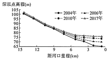 "]读图可知,2004 ~ 2017年深泓点高程数值越来越大,水越来越深,说明淤积速度呈下降趋势,故B正确;