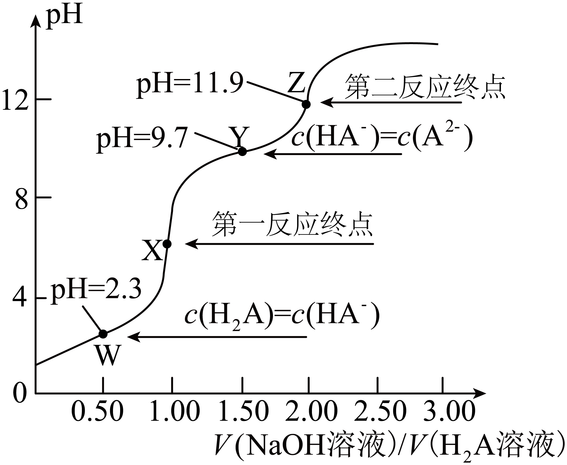 "]向$\rm 20.0\;\rm mL\;\rm 0.10\;\rm mol ⋅ L^{-1}H_{2}A$溶液中滴加$\rm 0.10\;\rm mol ⋅ L^{-1}NaOH$溶液,滴定过程发生反应:$\rm H_{2}A+OH^{-}=HA^{-}+H_{2}O$、$\rm HA^{-}+OH^{-}=A^{2-}+H_{2}O$,结合图像:$\rm X$点溶质为$\rm NaHA$,$\rm Z$点溶质为$\rm Na_{2}A$。