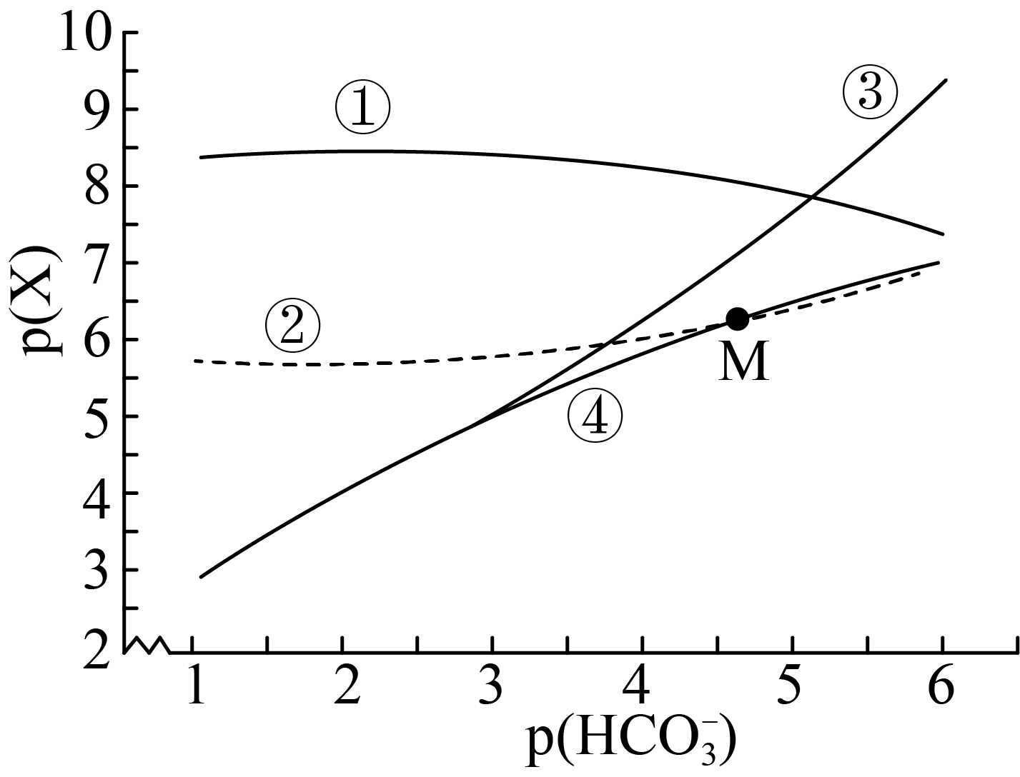 常温下,碳酸氢钠溶液中$\rm p(X)(X$为$\rm H_{2}CO_{3}$,$\text{CO}_{3}^{2-}$,$\rm H^{+}$或$\text{O}{{\text{H}}^{-}}\rm )$随$\text{p}\left( \text{HCO}_{3}^{-} \right)$变化曲线如下,其中$\rm p$表示负对数运算,如$\text{p}\left( {{\text{H}}_{2}}\text{C}{{\text{O}}_{3}} \right)=1$表示$c\left( {{\text{H}}_{2}}\text{C}{{\text{O}}_{3}} \right)=0.1\;\rm \text{mol}\cdot {{\text{L}}^{-1}}$,下列说法错误的是$(\qquad)$