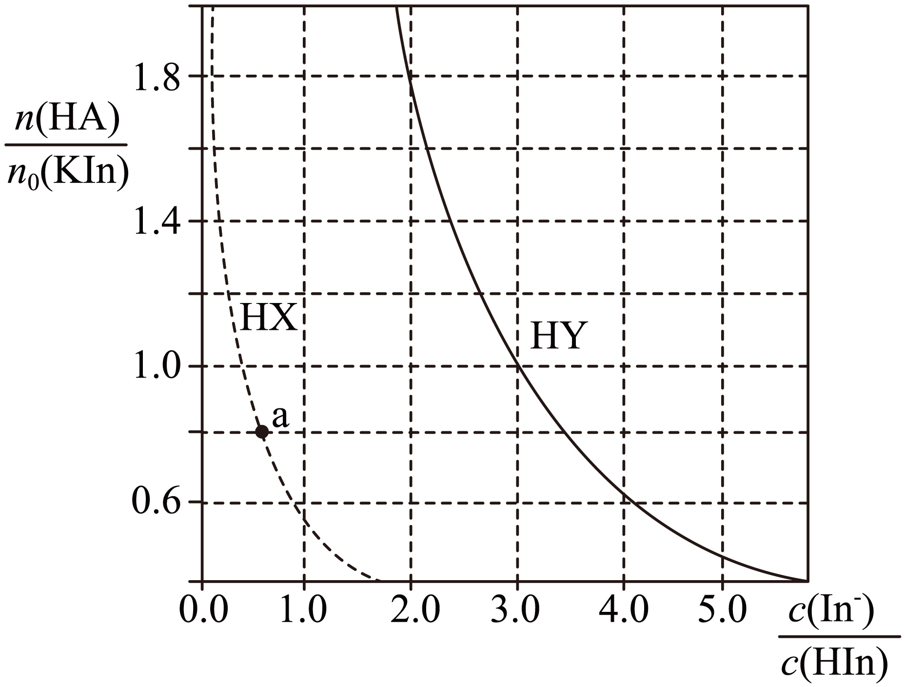在一定温度下,向某非水溶剂$\rm ($自身不电离$\rm )$中加入指示剂$\rm HIn$的钾盐$\rm KIn(KIn$完全电离,$\rm HIn$的电离常数${{K}_{\text{a}}}(\text{HIn})=3.6\times {{10}^{-20}}\;\rm \text{mol}\cdot {{\text{L}}^{-1}}\rm )$,再向该溶液中加入一元弱酸$\rm HX$或$\rm HY$,均发生反应$\rm \text{I}{{\text{n}}^{-}}\text{+HA}\rightleftharpoons {{\text{A}}^{-}}\text{+HIn}\rm (A$代表$\rm X$或$\rm Y)$。保持$\rm KIn$的起始量$\rm {{\textit{n}}_{\text{0}}}\text{(KIn)}$不变,平衡时测得$ \dfrac{c(\text{I}{{\text{n}}^{-}})}{c(\text{HIn})}$与$\rm \dfrac{\textit{n}(HA)}{{{\textit{n}}_{\text{0}}}\text{(KIn)}}\rm [\textit{n}(HA)$代表加入的$\rm HA$的物质的量$\rm ]$的关系如图所示。下列说法错误的是$\rm (\qquad)$