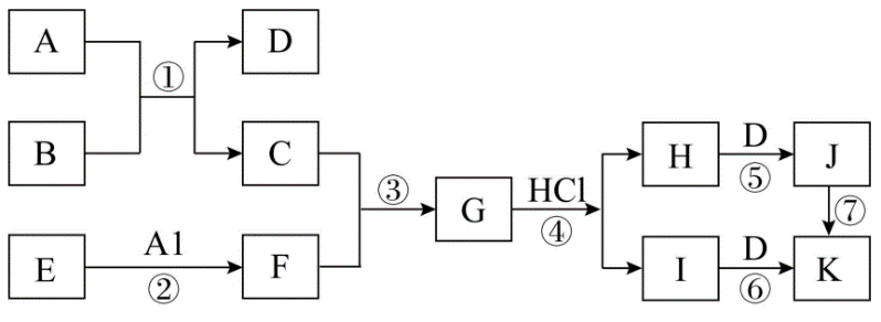 下图所示转化关系$\rm ($部分产物已略去$\rm )$中的$\rm A\sim K$为中学化学常见物质,$\rm A$为淡黄色固体,$\rm C$、$\rm F$为单质,$\rm J$在空气中可转化为红褐色固体$\rm K$。回答下列问题: