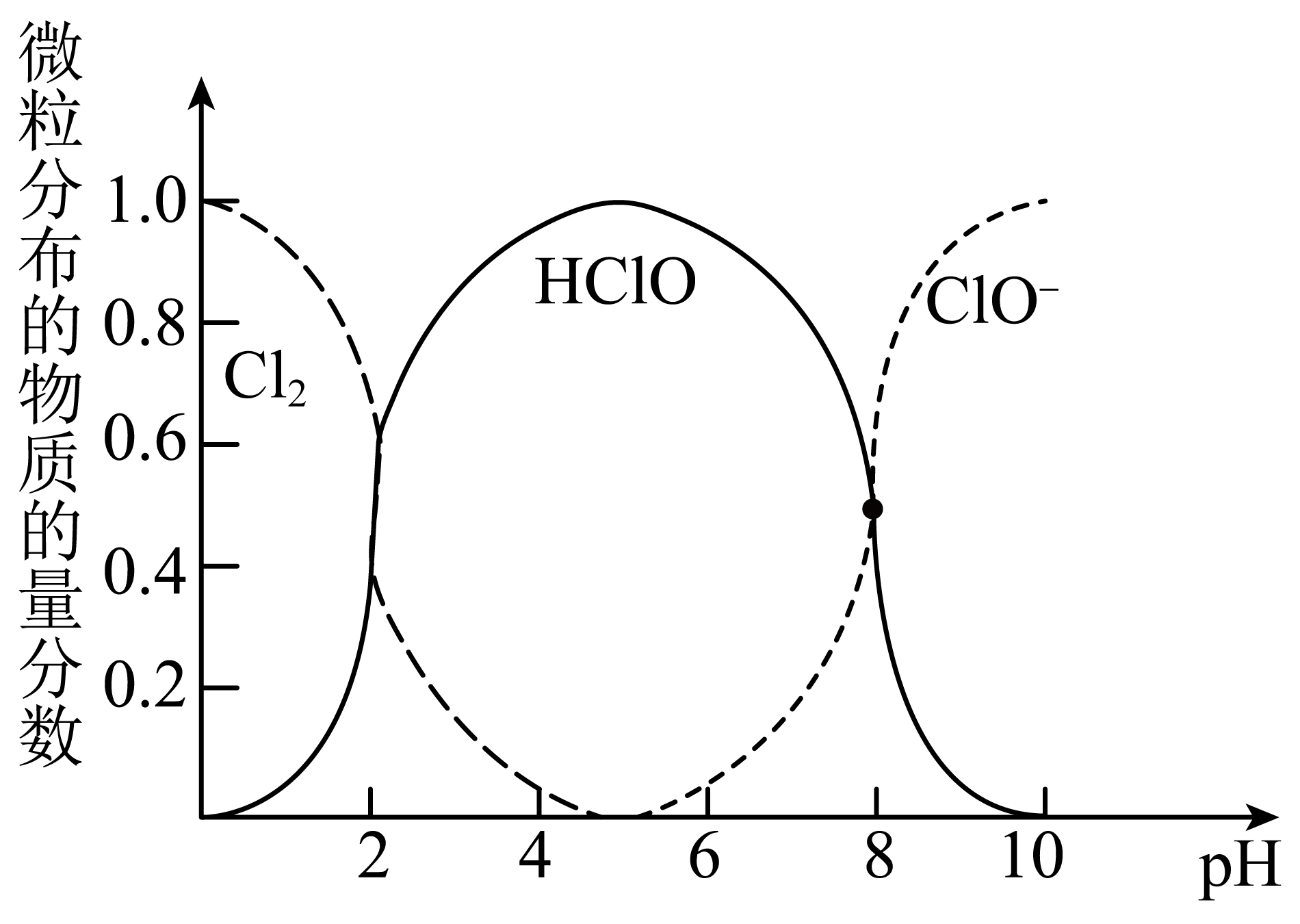 $\text{C}{{\text{l}}_{2}}$、$\text{HClO}$和$\text{Cl}{{\text{O}}^{-}}$三种微粒的物质的量分数随$\text{pH}\rm ($即$ {c}({{\text{H}}^{+}})\rm )$变化的关系如图所示。