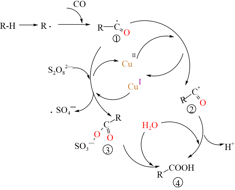 以$\rm H_{2}O$作为羟基源,$\rm K_{2}S_{2}O_{8}$作为自由基引发剂和氧化剂,通过烷烃的$\rm C-H$键直接插羰羧基,最终在溶剂化作用下生成羧酸的反应机理如下所示,下列说法正确的是$(\qquad)$