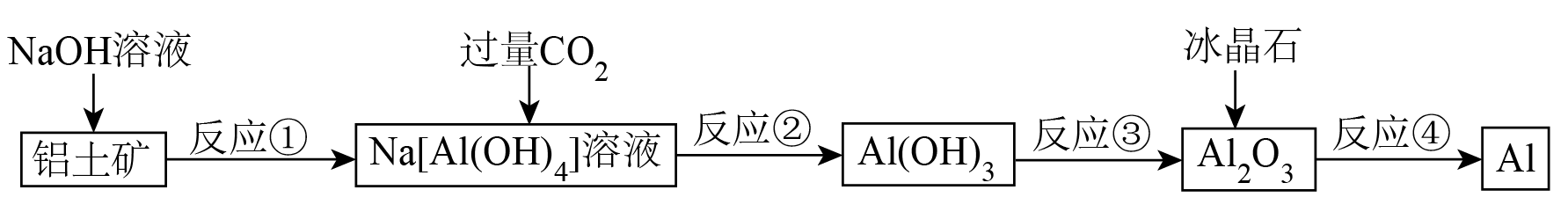 "]氢氧化钠溶液与铝土矿中的氧化铝反应后得到偏铝酸钠溶液,通入过量二氧化碳后,与偏铝酸钠转化为氢氧化铝沉淀和碳酸氢钠,氢氧化铝受热分解得到氧化铝,电解熔融氧化铝得到金属铝。