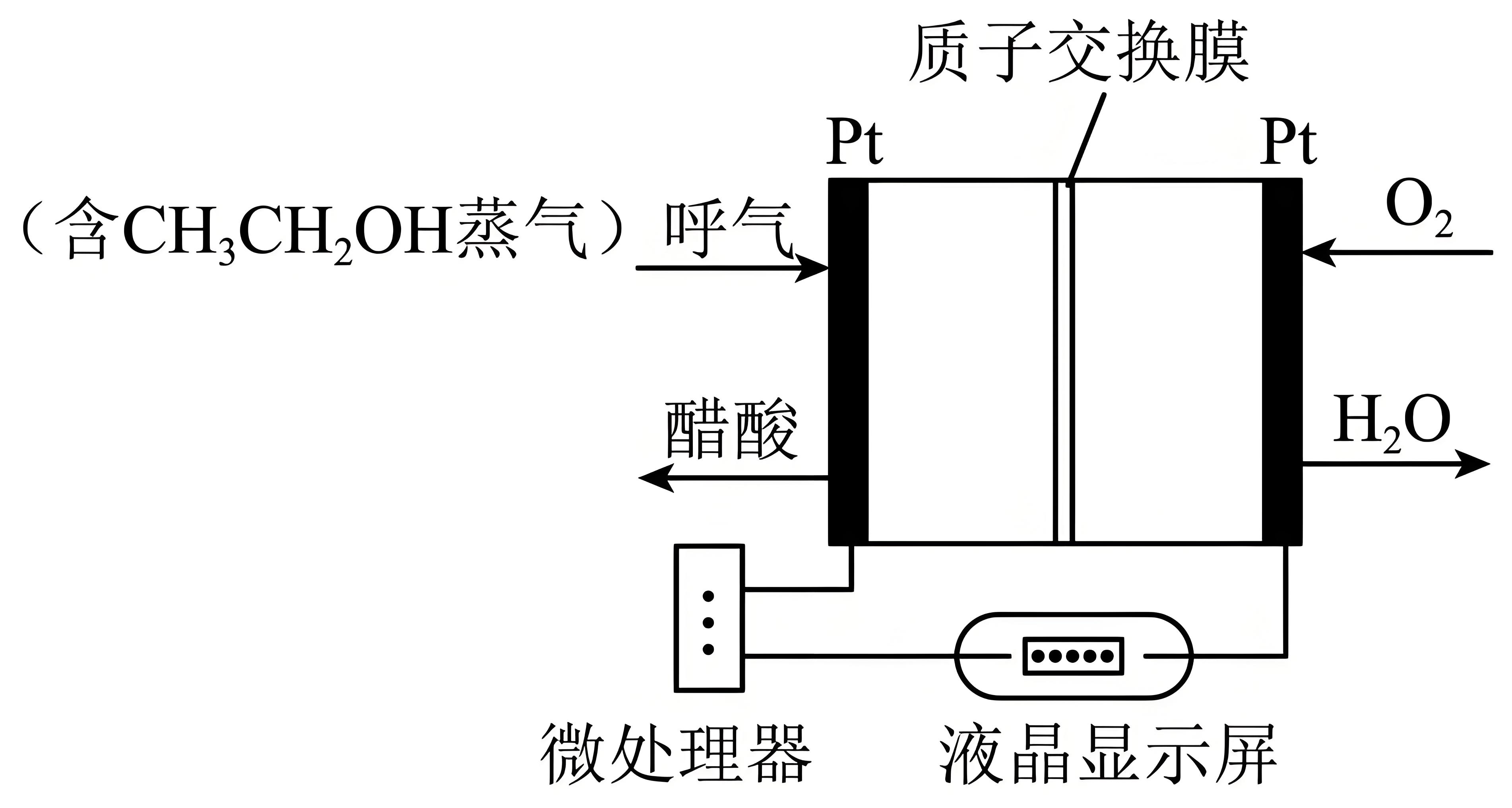 "]图为燃料电池,则通入氧气的$\rm Pt$电极为原电池的正极,酸性条件下,氧气在正极得到电子发生还原反应生成水,电极反应式为$\rm O_{2}\rm +\rm 4e^{-}\rm +\rm 4H^{+}\rm =\rm 2H_{2}O$;呼气通入的$\rm Pt$电极为原电池的负极,呼出的乙醇在负极失去电子发生氧化反应生成乙酸,电极反应式为$\rm {C}{{{H}}_{{3}}}{C}{{{H}}_{{2}}}{OH-4}{{{e}}^{-}}+{{{H}}_{{2}}}{O}={C}{{{H}}_{{3}}}{COOH+4}{{{H}}^{+}}$。