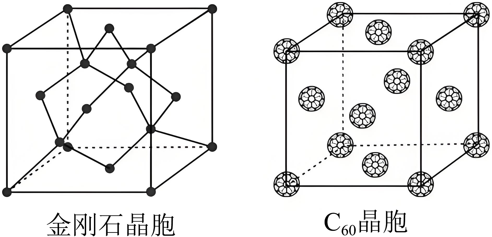 金刚石与${{\text{C}}_{60}}$的晶胞结构如图,比较二者熔点大小:金刚石 ${{\text{C}}_{60}}\rm ($填“$\gt $”、“$\lt $”或“$=$”$\rm )$,并从结构角度分析原因 。