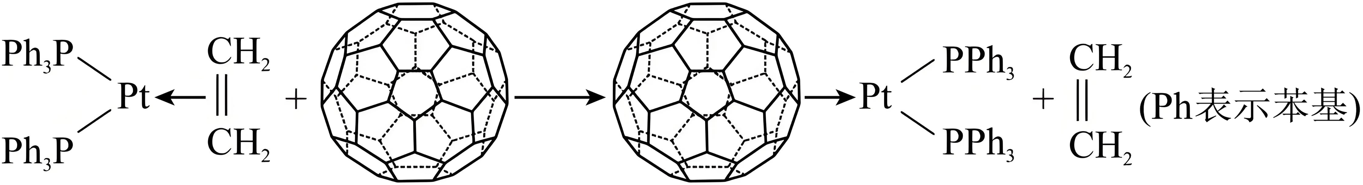 ②${{\text{C}}_{2}}{{\text{H}}_{4}}{{\text{C}}_{60}}$都是$\pi$配体,能够通过$\pi$电子与中心金属原子形成配位键,${{\text{C}}_{60}}$分子由$\rm 60$个碳原子组成,形成球状结构,每个碳原子通过$\text{s}{{\text{p}}^{\text{2}}}$杂化与相邻的三个碳原子形成$\sigma$键,未参与杂化的一个$\text{p}$轨道上的电子形成离域$\pi$键,具有更大的$\pi$电子云,因此其配位能力更强,则与$\rm Pt$的配位能力大小:${{\text{C}}_{2}}{{\text{H}}_{4}}\lt {{\text{C}}_{60}}$。