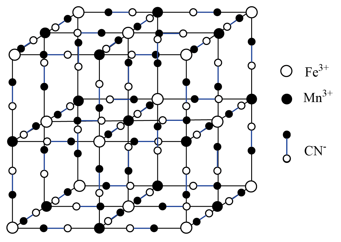 $\rm \overset{+3}{\mathop{Mn}}\,[\overset{+3}{\mathop{Fe}}\,{{(CN)}_{6}}]$可用作钾离子电池的正极材料,其晶胞结构如下图所示。