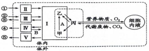 如图表示人体细胞与外界环境之间进行物质交换的过程,Ⅰ、Ⅱ、Ⅲ、Ⅳ、Ⅴ表示直接参与的几种系统或器官,①、②、③、④、⑤表示相关物质,甲、乙、丙表示三种液体,$\rm A$、$\rm B$表示相关过程。请据图回答: