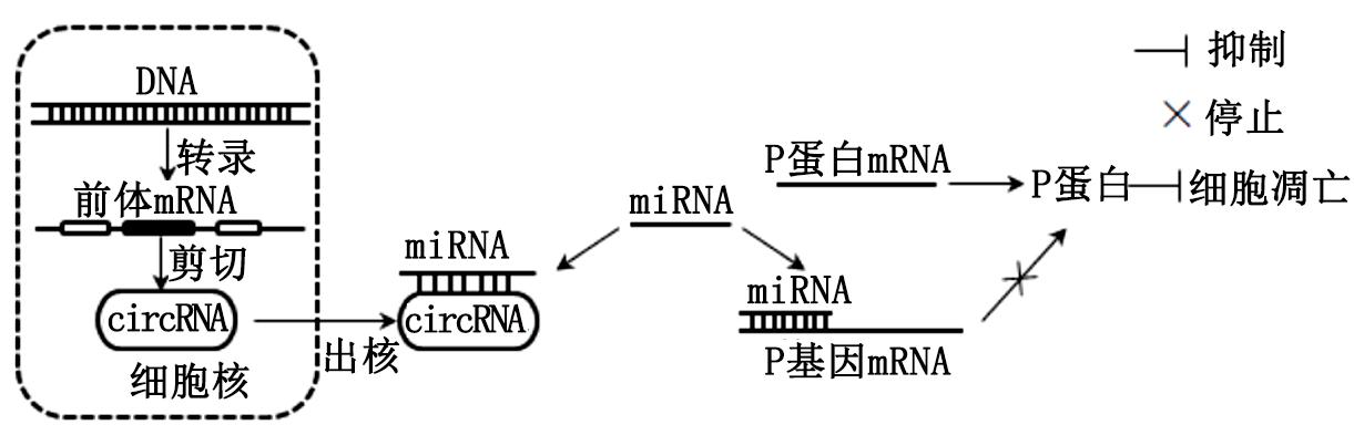 放疗是胸部恶性肿瘤主要的治疗方式之一,在临床上广泛使用。由于心脏位置特殊,放疗过程中的电离辐射诱导大量心肌细胞凋亡,导致放射性心脏损伤($\rm RIHD$)。一项新的研究表明,$\rm circRNA$可以通过$\rm miRNA$调控$\rm P$基因表达进而影响细胞凋亡,调控机制如图所示。$\rm miRNA$是细胞内一种单链小分子$\rm RNA$,可与$\rm mRNA$靶向结合并使其降解。$\rm circRNA$是细胞内一种闭合环状$\rm RNA$,可靶向结合$\rm niRNA$使其不能与$\rm mRNA$结合,从而提高$\rm mRNA$的翻译水平。请回答下列问题。