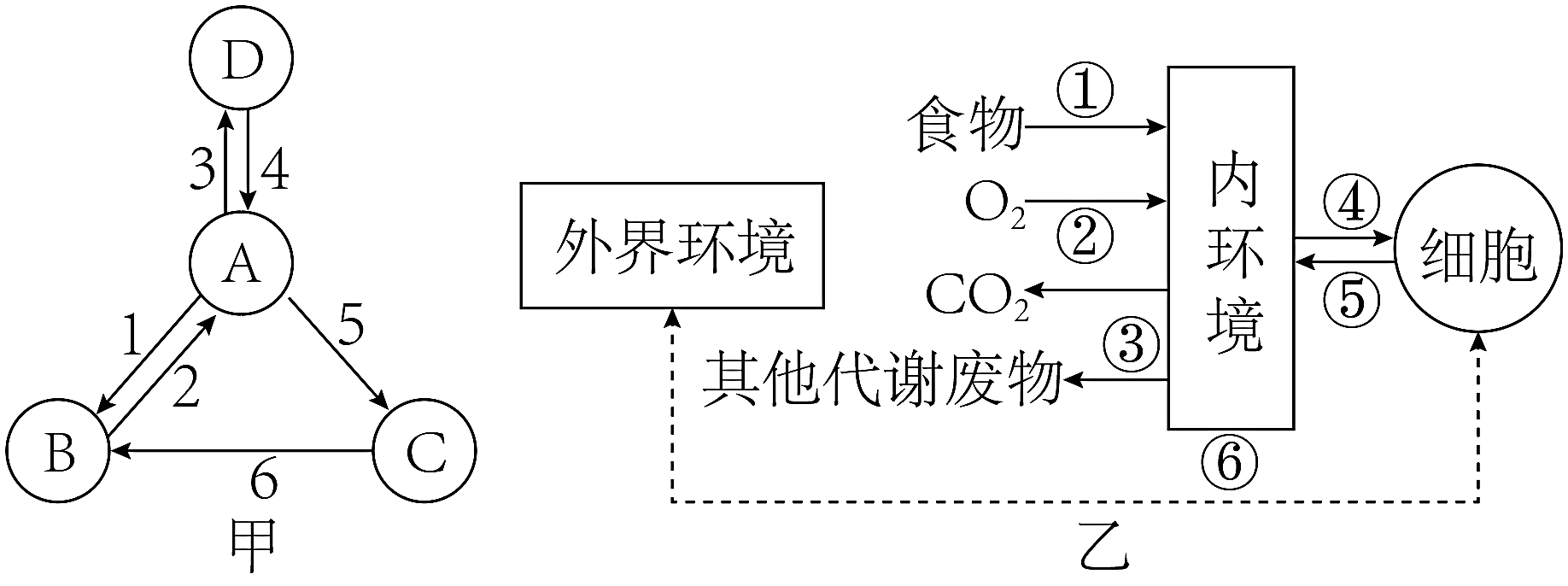 图乙:图乙中,①表示食物经消化吸收后进入内环境,②表示氧气经肺泡进入内环境,③表示内环境排出其他代谢废物,④是营养物质和氧气等进入细胞,⑤指代谢产物、二氧化碳等进入组织液。
