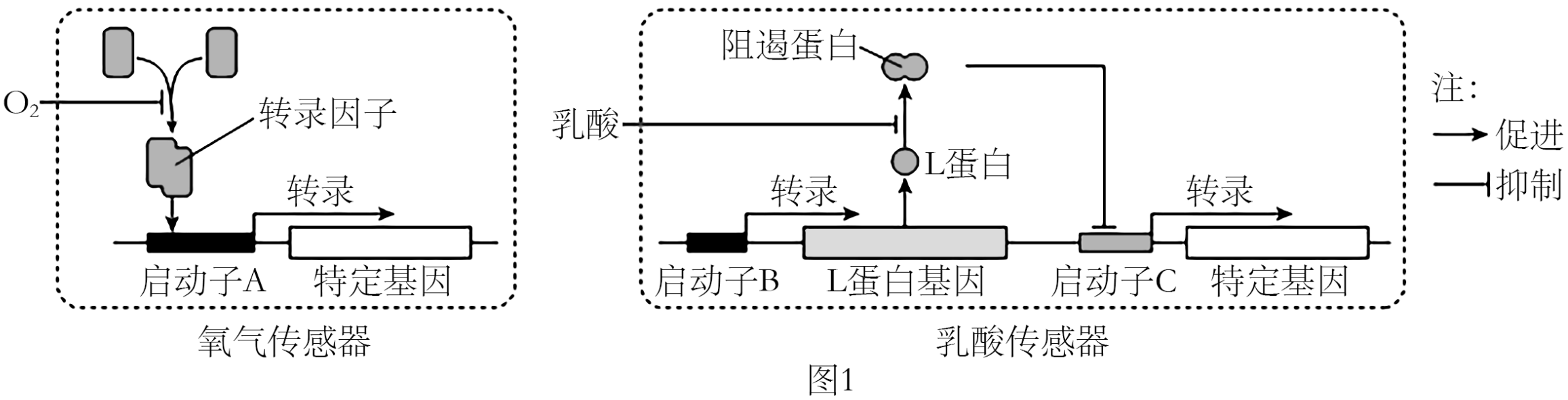 "]]用$\rm GFP$(绿色荧光蛋白)基因作为特定基因时,乳酸抑制$\rm L$蛋白转化为阻遏蛋白,而阻遏蛋白是抑制特定基因的启动子的功能。在无乳酸状态下$\rm GFP$基因的表达量偏高﹐传感器灵敏度低,可增多启动子$\rm B$和$\rm L$蛋白基因的数目,使阻遏蛋白的含量增大;减少启动子$\rm C$和特定基因的数目,使绿色荧光蛋白的含量减少。