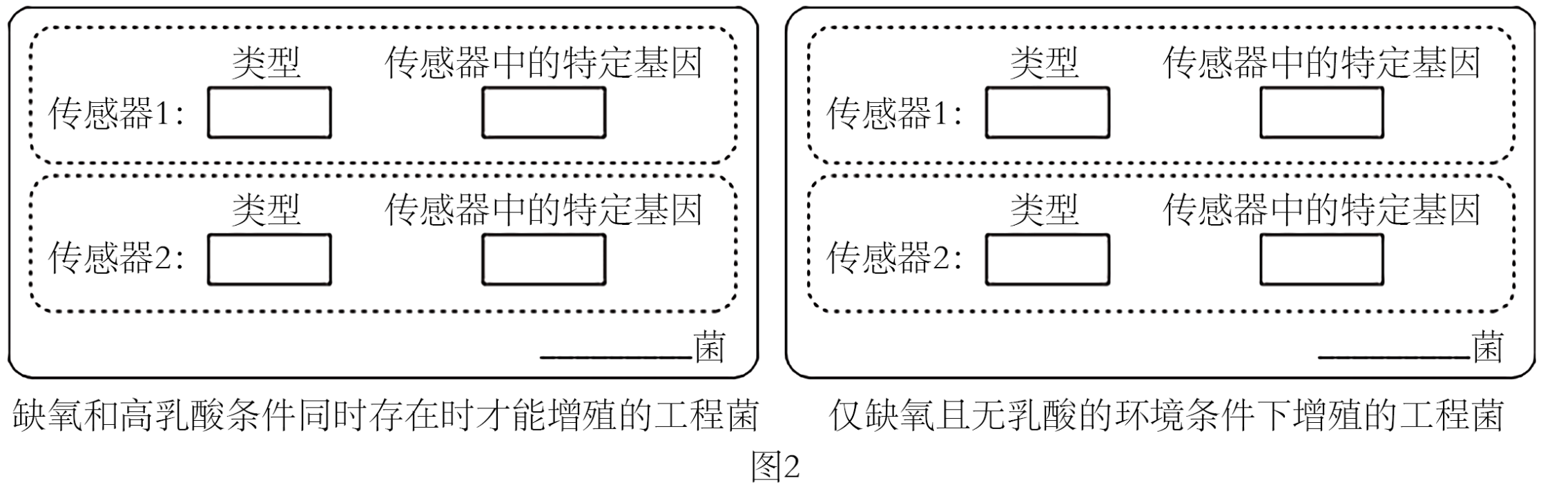 缺氧和高乳酸条件同时存在时才能增殖的工程菌:传感器$\rm 1$:类型 ;传感器中的特定基因 ;传感器$\rm 2$:类型 ;传感器中的特定基因 ; 菌