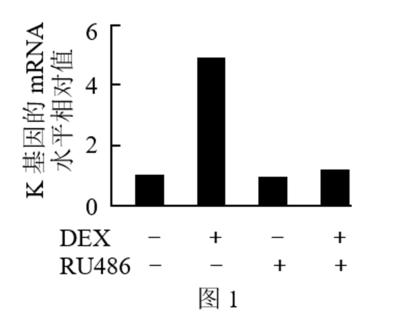 "]]由图可知单独用地塞米松($\rm DEX$)处理的小鼠肝脏细胞$\rm K$基因的$\rm mRNA$水平相对值升高,$\rm DEX$是糖皮质激素类药物,用$\rm DEX$和$\rm RU486$(糖皮质激素受体拮抗剂)处理小鼠,肝脏细胞$\rm K$基因的$\rm mRNA$水平相对值与未加入地塞米松($\rm DEX$)处理的一致,$\rm DEX$无法与靶细胞的皮质激素受体结合,说明$\rm RU486$能阻断$\rm DEX$与糖皮质激素受体结合,因此实验结果表明$\rm DEX$与糖皮质激素受体可以结合,促进$\rm K$基因的转录。