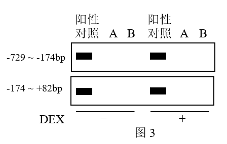 分离($\rm 2$)中小鼠肝脏细胞核物质,用超声波破碎$\rm DNA$(与蛋白质结合区不易被超声波破碎),分别加入抗$\rm K$抗体($\rm A$)和无关抗体($\rm B$),进行免疫沉淀实验。以沉淀下来的$\rm DNA$为模板,根据$\rm P$基因$\rm -729\sim -174$、$\rm -174\sim +82bp$区域序列分别设计引物进行$\rm PCR$,电泳结果支持($\rm 3$)的结论。请在下图$\rm 3$中补充实验结果 。