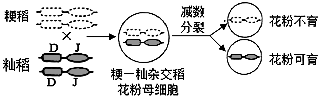 粳稻和籼稻是水稻的两个品种,二者杂交所产生的子代会出现部分花粉不育现象。研究显示,该现象与来自籼稻的$\rm 12$号染色体上的一段$\rm DNA$有关。该段$\rm DNA$含有$\rm 2$个紧密相邻的基因$\rm —$基因$\rm D$和基因$\rm J$,基因$\rm D$编码的毒蛋白$\rm D$可以杀死花粉,基因$\rm J$编码的蛋白质$\rm J$能解除$\rm D$蛋白的毒性。研究发现,粳$\rm -$籼杂交稻产生的花粉中,$\rm 12$号染色体来源于粳稻的不育,来源于籼稻的则可育(如图所示)。据图分析,下列说法正确的是$\rm (\qquad)$