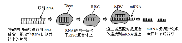 "]分析题图:图示表示$\rm RNA$干扰现象示意图,$\rm Dicer$酶能特异识别双链$\rm RNA$,切割产生的干涉 $\rm RNA$与一系列酶结合组成诱导沉默复合体$\rm (RISC)$;$\rm RISC$通过碱基配对结合到与干涉 $\rm RNA$同源的$\rm mRNA$上,并切割该$\rm mRNA$,造成蛋白质无法合成。