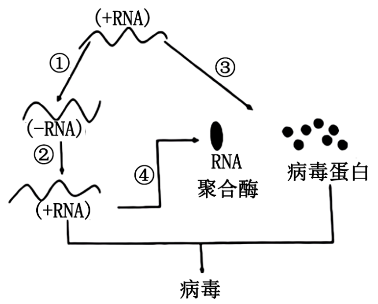 ","新冠病毒的$\\rm RNA(\\rm +)$进入宿主细胞后可同时进行①、④过程