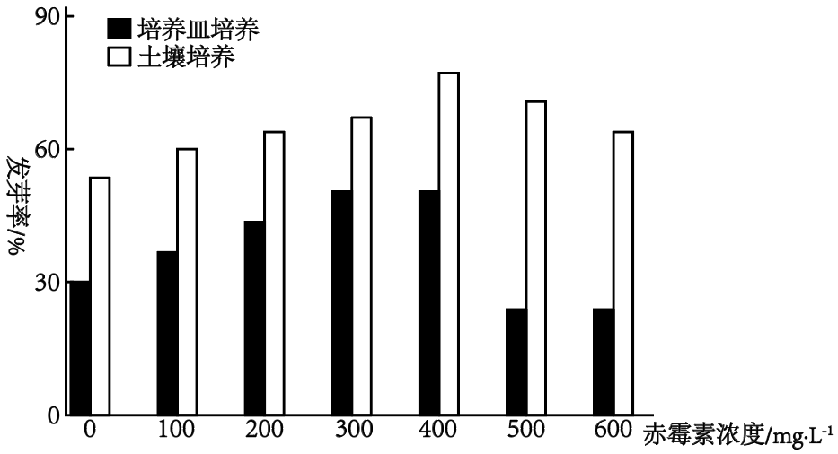 "]在土壤中的培养条件下,和对照组(赤霉素浓度为$\rm 0$)相比,不同浓度的赤霉素对于杜梨种子的影响只体现了促进,没有体现抑制,故不能体现两重性;而在培养皿培养的条件下,在一定范围内,随着赤霉素浓度的增加,对种子的发芽率的促进作用增强,但浓度达到$\rm 500\;\rm mg/L$,反而抑制种子的发芽。