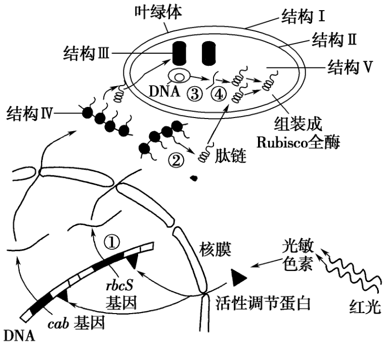 光敏色素是一类红光$\rm /$远红光受体,在调节植物叶绿体的发育等方面发挥重要作用。某植物叶肉细胞受到红光照射后,通过光敏色素激活相关调节蛋白,调控有关蛋白质合成(如图$\rm 1$)。图中$\rm cab$基因控制合成的蛋白质是叶绿体内结构Ⅲ膜组成成分,$\rm rbcS$基因控制合成的多肽与另一种叶绿体$\rm DNA$控制合成的多肽组装成$\rm Rubisco$全酶(催化$\rm CO_{2}$的固定)。图中序号①$\sim$④代表生理过程。请分析回答: