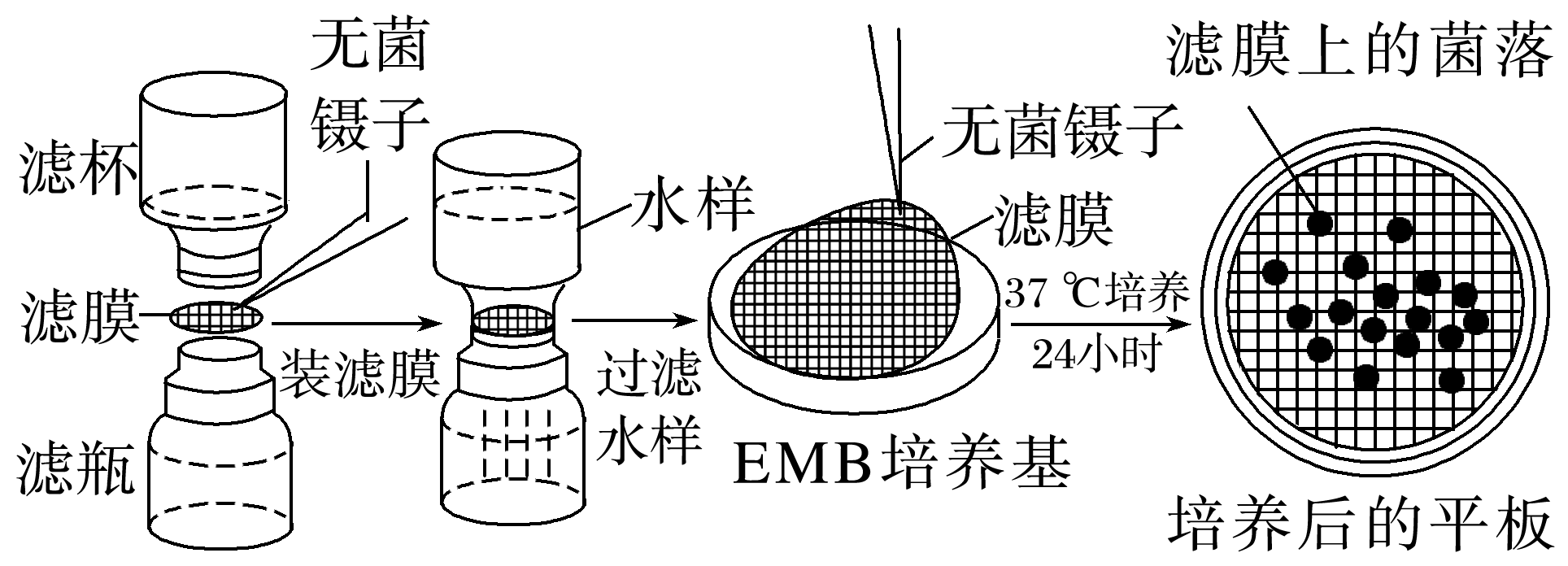 "]滤膜法是检测水样中大肠杆菌群的方法。将一定量水样注入已灭菌的微孔薄膜的滤器中,经过抽滤,细菌被截留在滤膜上,将滤膜贴于($\rm EMB$培养基$\rm )$上,经培养后计数和鉴定滤膜上生长的大肠杆菌菌落,依据过滤水样体积计算每升或每$\rm 100$毫升水样中的大肠杆菌菌群数。该方法操作简单、快速,主要适用于杂质较少的水样。