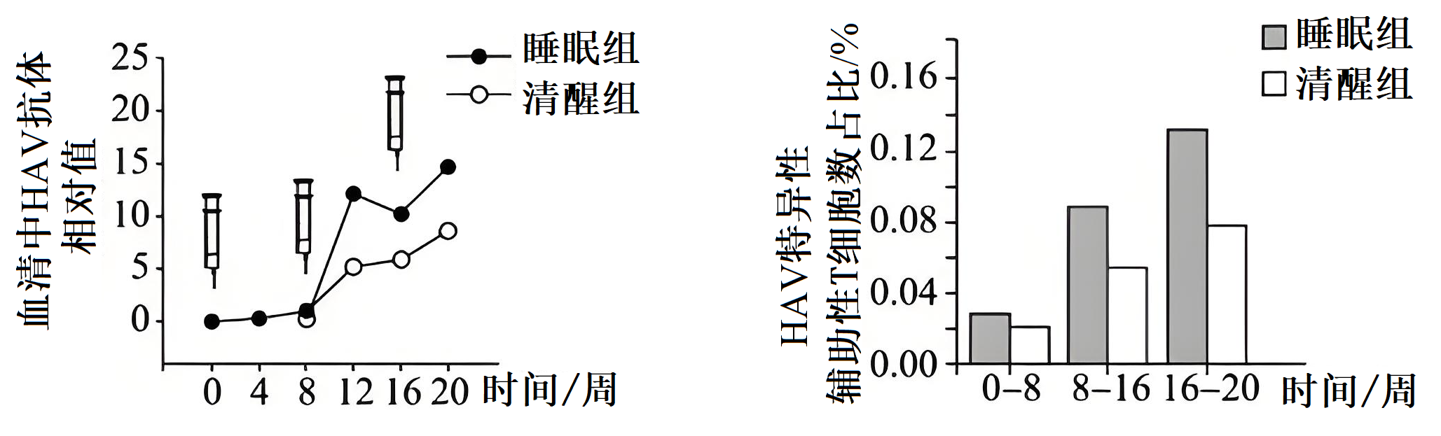 为检测睡眠对甲型肝炎病毒($\rm HAV$)疫苗效果的影响,研究人员分别为受试者在第$\rm 0$、$\rm 8$和$\rm 16$周注射三次疫苗,并在接种当晚要求受试者睡眠或持续清醒,得到实验结果如下图。下列叙述正确的是$\rm (\qquad)$