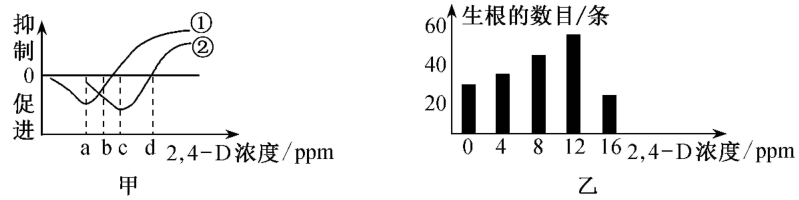 某兴趣小组用生长素类调节剂$\rm 2$,$\rm 4-D$对某植物进行了两次实验并得到甲、乙两图所示结果,图甲中两条曲线分别表示不同浓度$\rm 2$,$\rm 4-D$对该植物茎和根生长的影响;图乙是用不同浓度的$\rm 2$,$\rm 4-D$溶液处理该植物的扦插枝条生根的情况。回答下列问题: