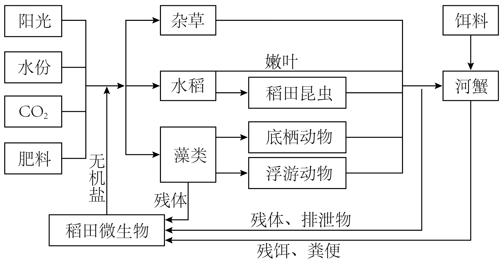 大米、河蟹是某城市农业的重要支撑产业。某市已成为全国最大稻蟹综合种养基地和全国最大河蟹种苗生产基地。如图表示某稻蟹共生系统内的部分结构,回答下列问题: