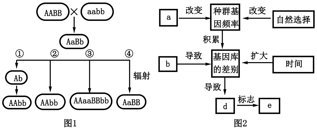 如图 $\rm 1$ 为育种方法图解,图中数字表示不同育种过程用到的方法:图 $\rm 2$ 为物种形成过程模式图,图中字母表示物种形成过程中的环节。下列叙述错误的是$\rm (\qquad)$