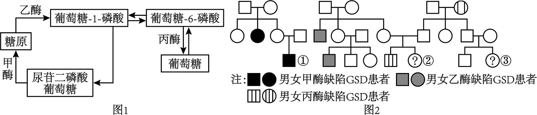 甲乙丙三种酶参与葡萄糖和糖原之间的转化,过程如图 $\rm 1$ 所示。任一酶的基因发生突变导致相应酶功能缺陷,均会引发 $\rm GSD$ 病。图 $\rm 2$ 为三种 $\rm GSD$ 亚型患者家系,其中至少一种是伴性遗传。不考虑新的突变,下列分析正确的是