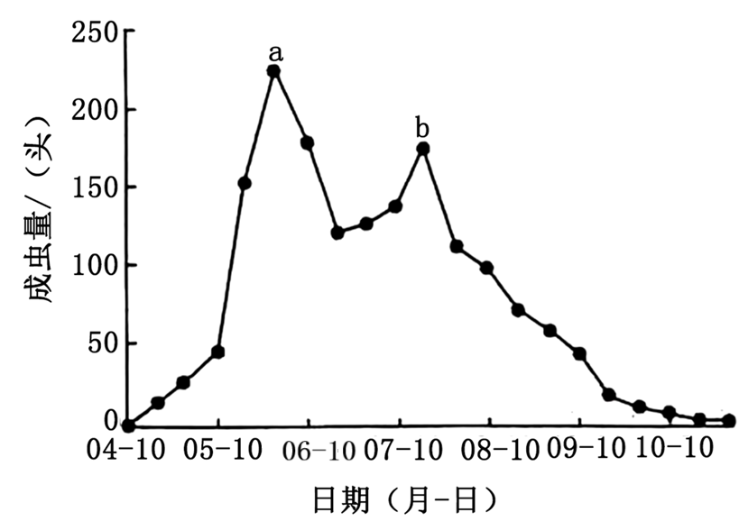 ","$\\rm b$点数量小于$\\rm a$点数量,可能是由于幼叶成熟,食物来源减少所致