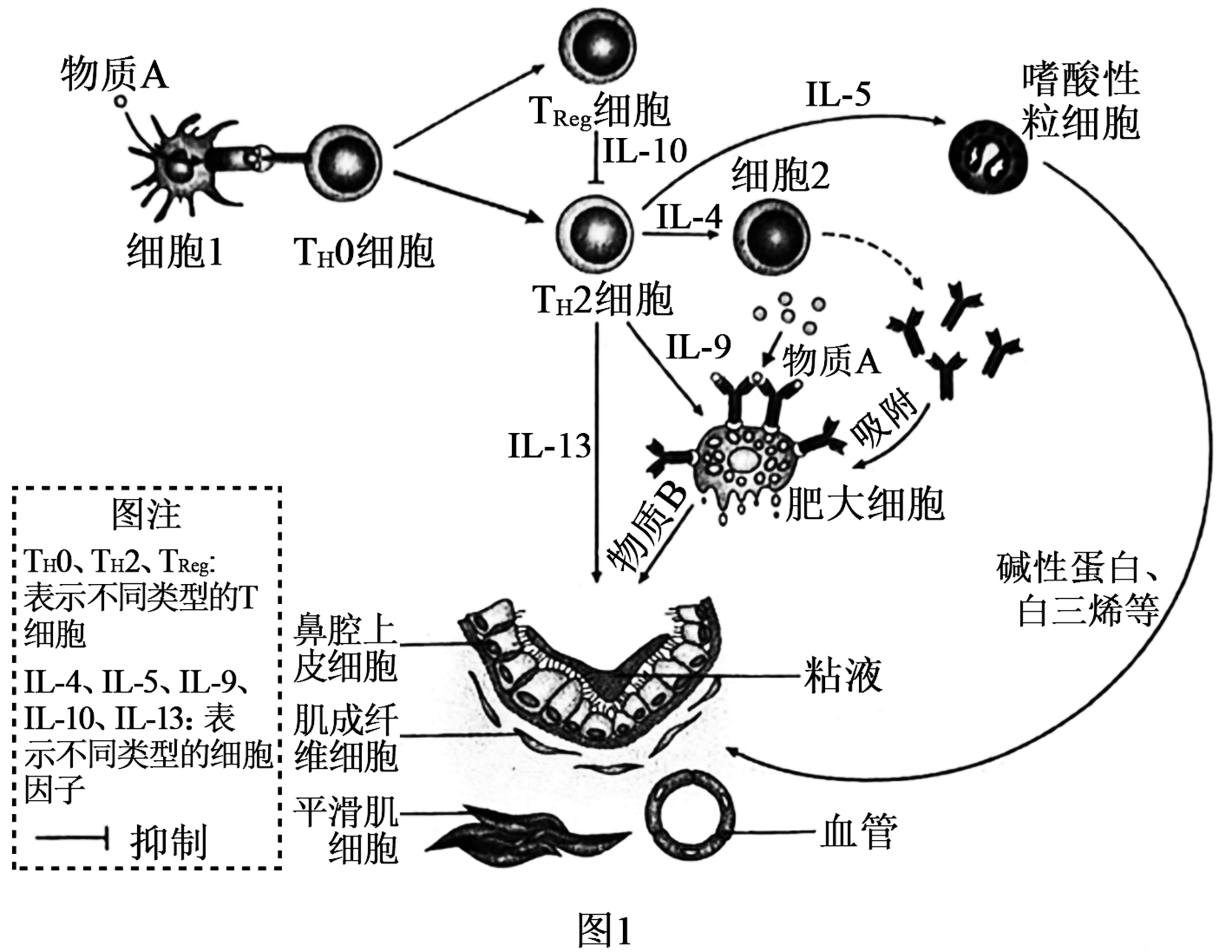 "]]过敏性鼻炎属于过敏反应,引发过敏反应的物质是过敏原,当人体首次接触过敏原,会激发人体产生体液免疫产生抗体,吸附在细胞膜表面; 图中细胞$\rm 1$是抗原呈递细胞,可以摄取、处理和呈递抗原。