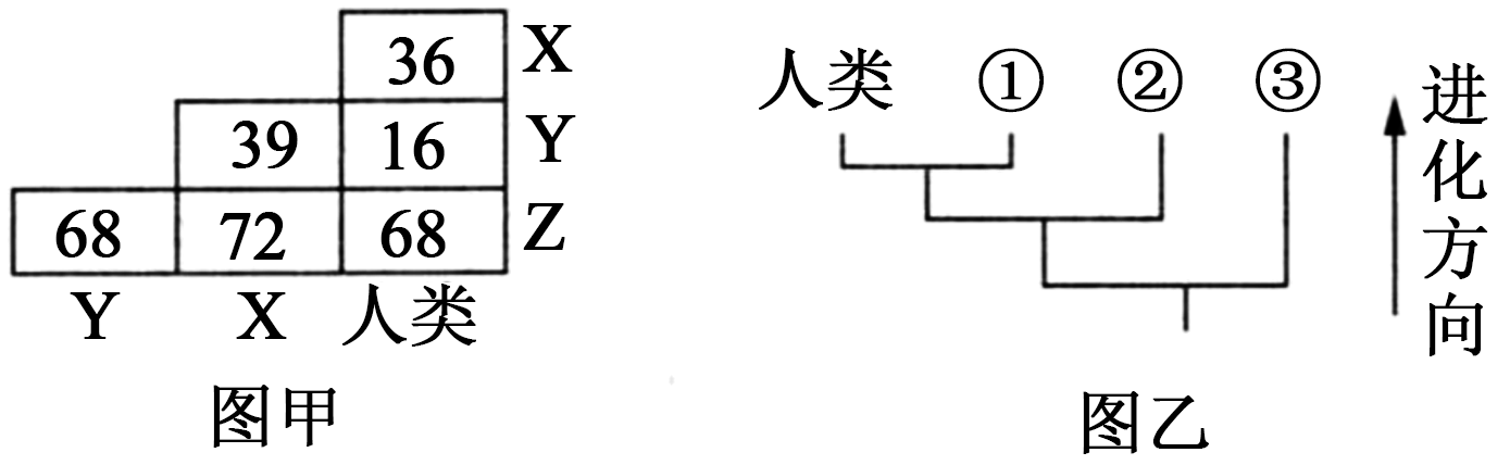 ","图甲中人类与动物$\\rm Z$的亲缘关系最远,图乙中①代表动物$\\rm Y$,②代表动物$\\rm X$