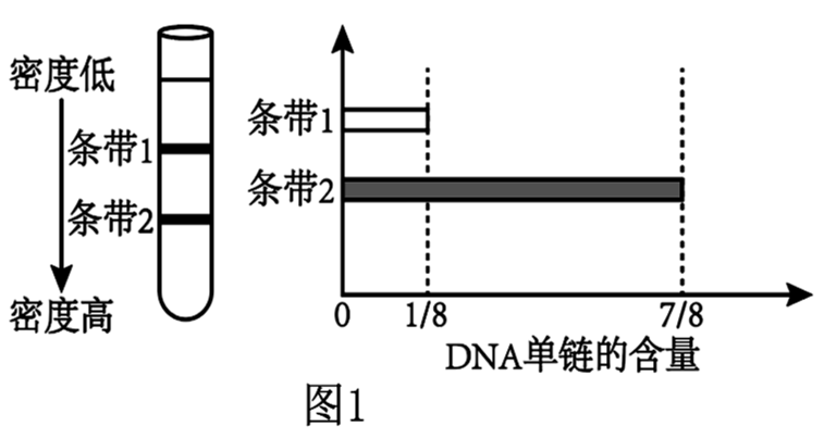 研究者将$\rm 1$个含$\rm ^{14}N/^{14}N-DNA$的大肠杆菌转移到以$\rm ^{15}NH_{4}Cl$为唯一氮源的培养液中,培养$\rm 24\;\rm h$后,提取子代大肠杆菌的$\rm DNA$,将$\rm DNA$双链解开再进行密度梯度离心,试管中出现两种条带,如图$\rm 1$所示。