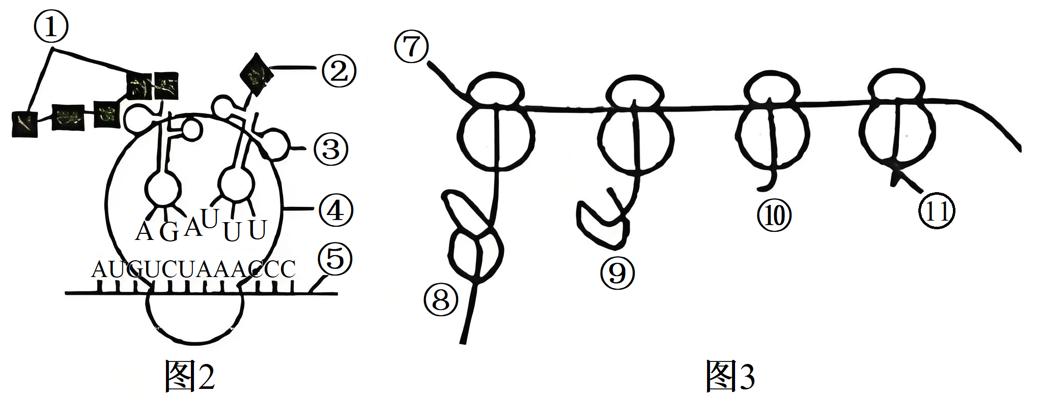 "]图$\rm 2$中⑤为$\rm mRNA$,④是核糖体,在翻译过程中核糖体沿着$\rm mRNA$移动,方向为$\rm 5$’到$\rm 3$’,根据$\rm tRNA$携带氨基酸的一侧为$\rm 3$'端,$\rm mRNA$与$\rm tRNA$方向互补,故图$\rm 2$中核糖体的移动方向为从左向右,图$\rm 3$中根据多肽链的长度,可判断核糖体的移动方向为从右向左,$\rm A$正确,$\rm BCD$错误。