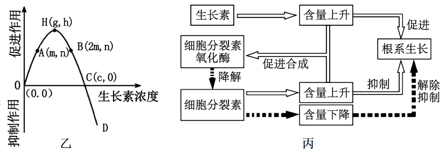 根据图丙分析,生长素含量上升会促进根系生长,同时会促进细胞中 (填物质名称)的合成,该物质会促进细胞分裂素降解,使细胞分裂素含量下降,进而 (填“促进”或“抑制”)对根系生长的抑制作用,从而实现对根系生长的促进。