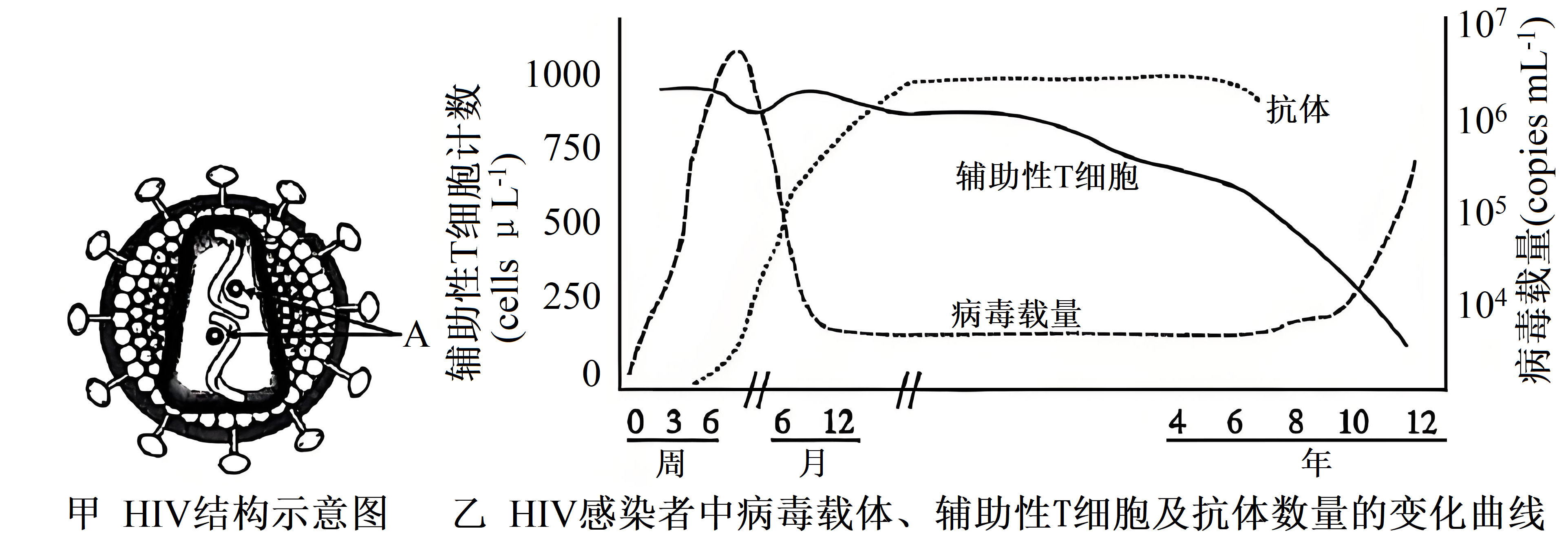 $\rm HIV$ 是逆转录病毒,逆转录过程需要逆转录酶的催化,所以图甲中 $\rm A$ 表示逆转录酶。其在人体细胞中增殖过程中的遗传信息流向是:以自身 $\rm RNA$ 为模板,在逆转录酶作用下合成 $\rm DNA$,$\rm DNA$ 再转录形成 $\rm RNA$,$\rm RNA$ 翻译形成蛋白质,