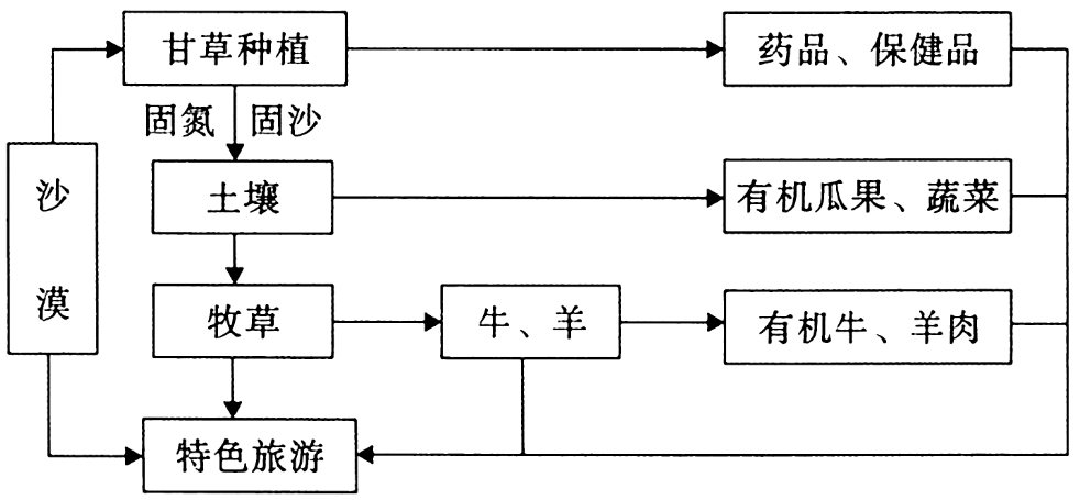 内蒙古库布齐因人口增加与过度垦荒、放牧等,植被破坏,沙漠化加剧。新中国成立后,通过多方协作治理(植树造林、沙障固沙等),植被覆盖率从$\rm 3\%$升至$\rm 53\%$,流动沙丘减少超$\rm 50\%$,沙尘暴锐减,并发展出七星湖、响沙湾等生态旅游区。如图是其治沙模式示意图,请回答下列问题: