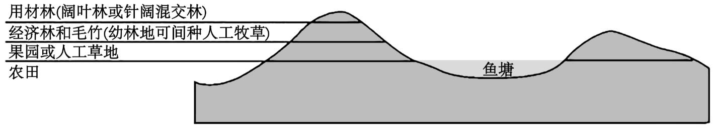 “用材林$\\rm —$经济林和毛竹$\\rm —$果园或人工草地”的布局充分利用了群落的垂直结构